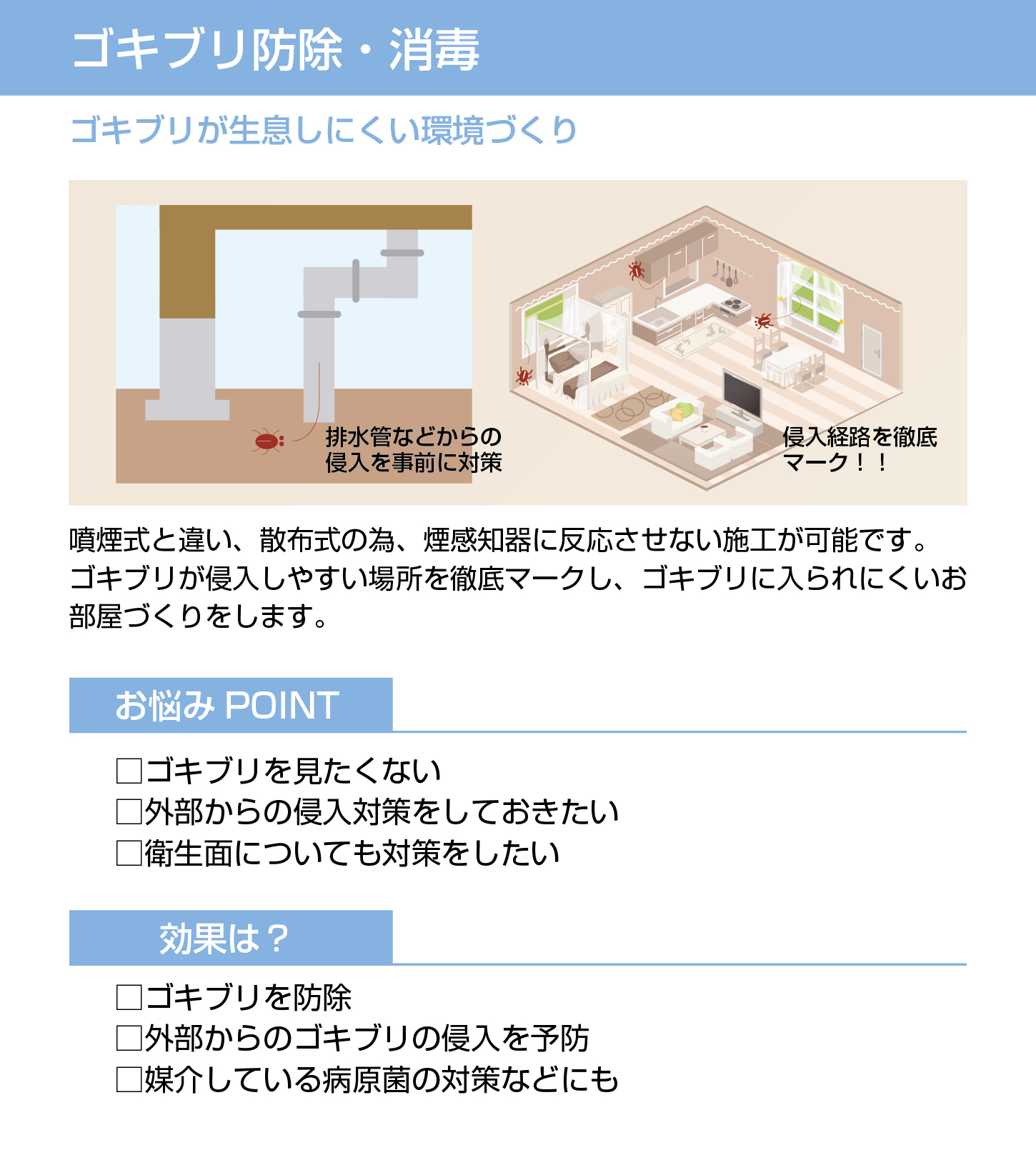 万一、ゴキブリ駆除施工後に、発生が防げなかった場合、半年間は、無償・回数無制限で補償させていただきます。なお、施工に際し、管理会社様の立ち会いは不要です。弊社スタッフが御社指定の日に物件に伺い、丁寧かつスピーディーに施工を行います。